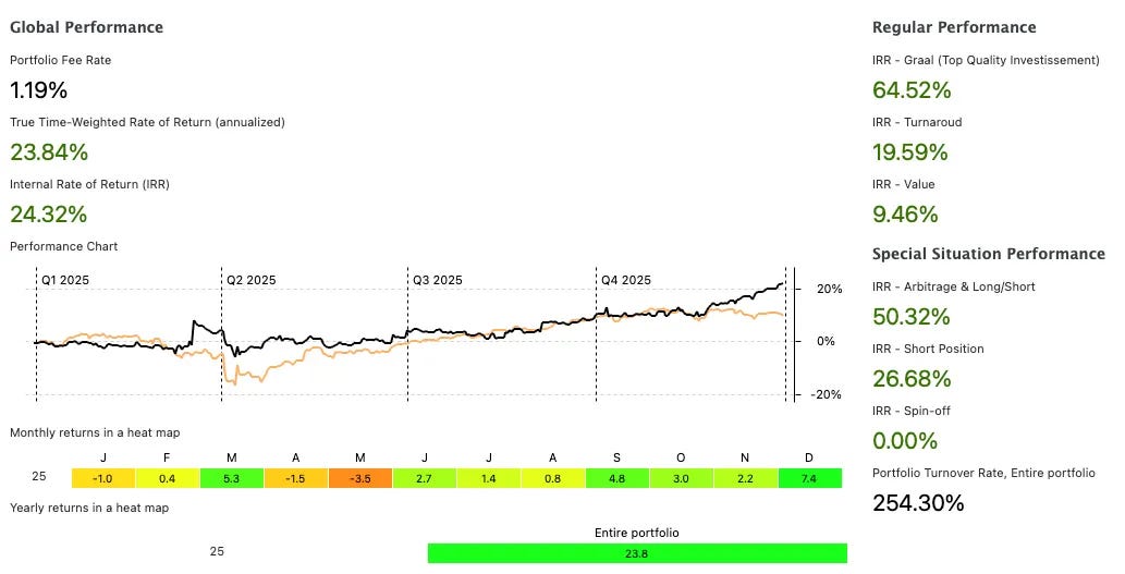 Je termine l’année 2025 avec un rendement de 24% et mon IRR depuis le tout début a descendu à 27% (6y). Je suis déçu de mon année, non pas pour le rendement, même s’il est plutôt normal si on prend en considération que le TSX (Canada) a fini l’année (2025) à plus de 29%. Ma déception est causée par plusieurs erreurs, des mauvais investissements de type value (ce type d’investissement représentait une grande portion de mon portefeuille) qui m’ont coûté plus de 20 % de ma performance de 2025 et mon choix d’être en mode défensif causé par des marchés nord-américains sur-évalués. Je vais réduire mon nombre d’investissement de type value et de situations spéciales au strict minimum pour 2026, même si je dois garder une plus grosse portion en cash.